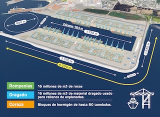 Puerto Exterior contempla la construcción de un molo de abrigo o muro rompeolas de casi 4 kilómetros de longitud, que tendrá dos terminales semiautomatizados de 1.730 metros cada uno, con capacidad para recibir, en forma simultánea, hasta ocho buques de 400 metros de largo, los de mayor tamaño que hoy navegan en el mundo.