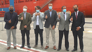 El alcalde de Valparaíso, Jorge Sharp; el gerente general de TPS, Oliver Weinreich; Matías Quiroga, gerente comercial de Retail y Lifestyle Sales WCSA de Maersk; Roberto Fernández, director regional de Aduana Valparaíso; Juan Marcos Mancilla, gerente de logística de la Empresa Portuaria Valparaíso; Sergio Baeza, presidente de Cotraporchi y representantes de los sindicatos de trabajadores portuarios de Valparaíso participaron de la ceremonia con la que se celebró la llegada del servicio a la ciudad.