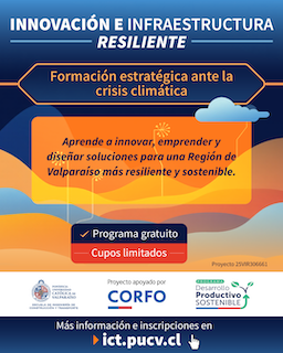 La Escuela de Ingeniería de Construcción y Transporte de la Pontificia Universidad Católica de Valparaíso abrió las postulaciones al programa formativo “Innovación e infraestructura resiliente: Formación estratégica ante la crisis climática”, de carácter gratuito financiado por Corfo.