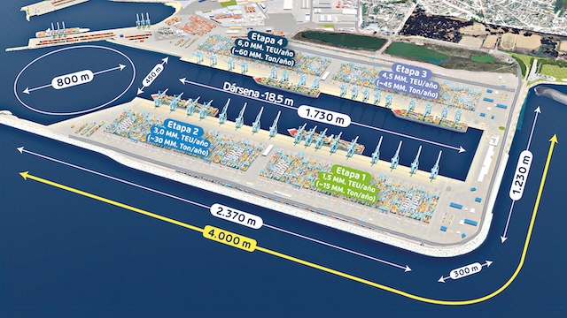 La licitación contempla la adjudicación de un contrato para la construcción del molo de abrigo (de aproximadamente 4 kilómetros de extensión), el dragado para la generación de la dársena y el canal de acceso, las explanadas, el acceso ferroviario con dos estaciones e instalaciones de faenas, junto con medidas de compensación y mitigación medioambiental. Esto implicará una inversión de la Empresa Portuaria San Antonio de USD 1.950 millones.