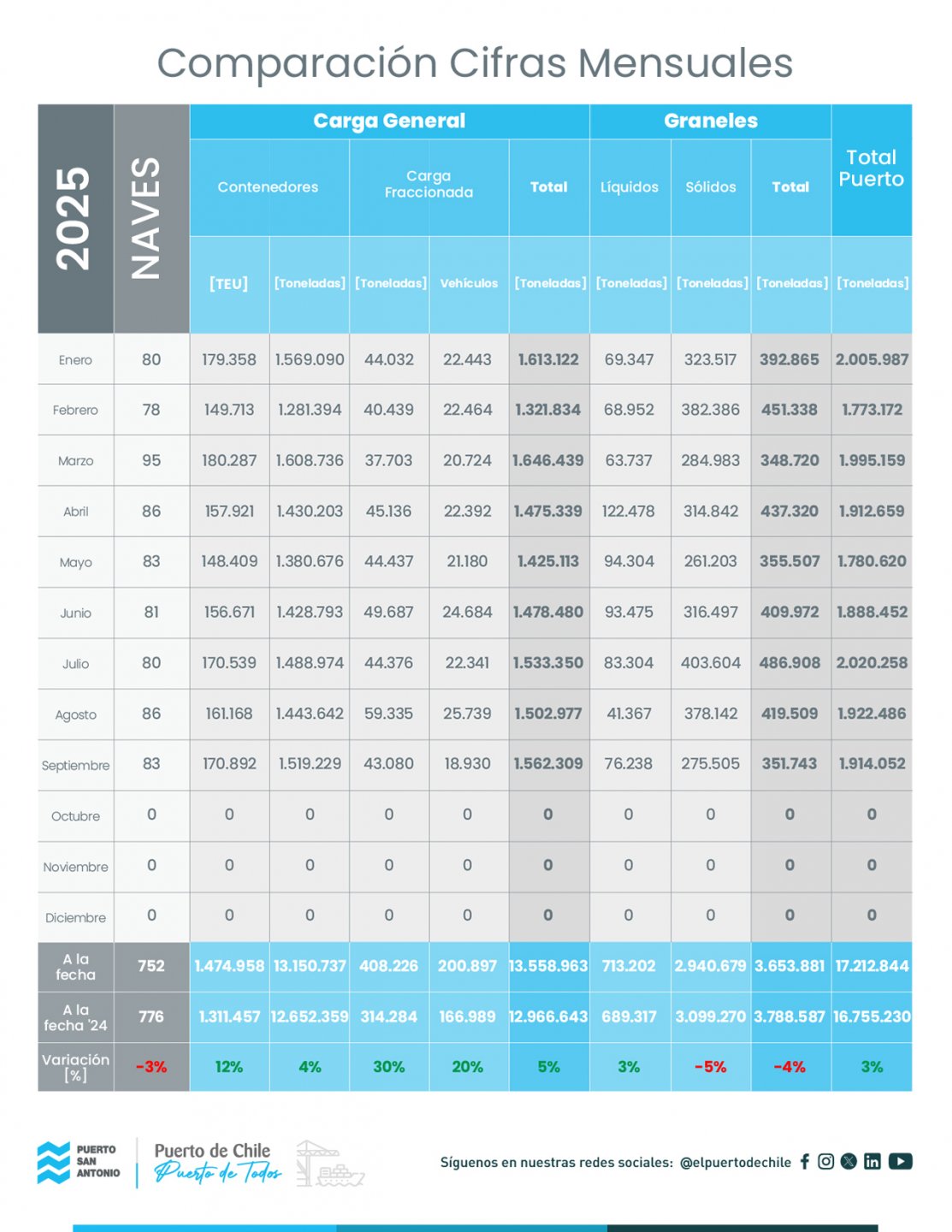 Un aumento del 12% en movimiento de contenedores de 20 pies (TEU) registraron los terminales de puerto San Antonio de enero a septiembre comparado con los registros de igual periodo de 2024.