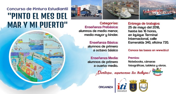 El concurso “Pinto el Mes del Mar y mi puerto” está dirigido a estudiantes de prebásica, básica y media de todos los establecimientos educacionales de la región. Los trabajos se desarrollan en técnica libre y el plazo de entrega es el viernes 26 de mayo, hasta las 16.00 horas, en las oficinas de ITI, ubicadas en Esmeralda 340, piso 7.