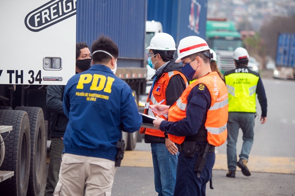 Este lunes Puerto San Antonio junto a la Policía de Investigaciones (PDI), la Armada de Chile, Aduanas y personal de Salud realizaron una fiscalización sanitaria y técnica a los conductores de camiones en el Nodo Logístico.